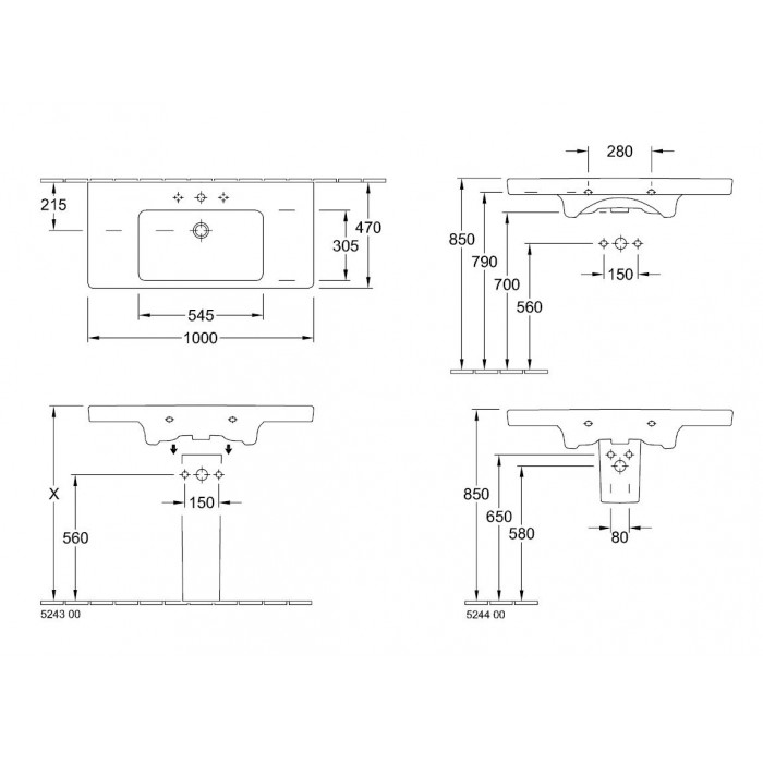 Washbasin Wall-mounted 80x47x16 semi pedestal / full pedestal With 1 bowl With hole in the middle m..