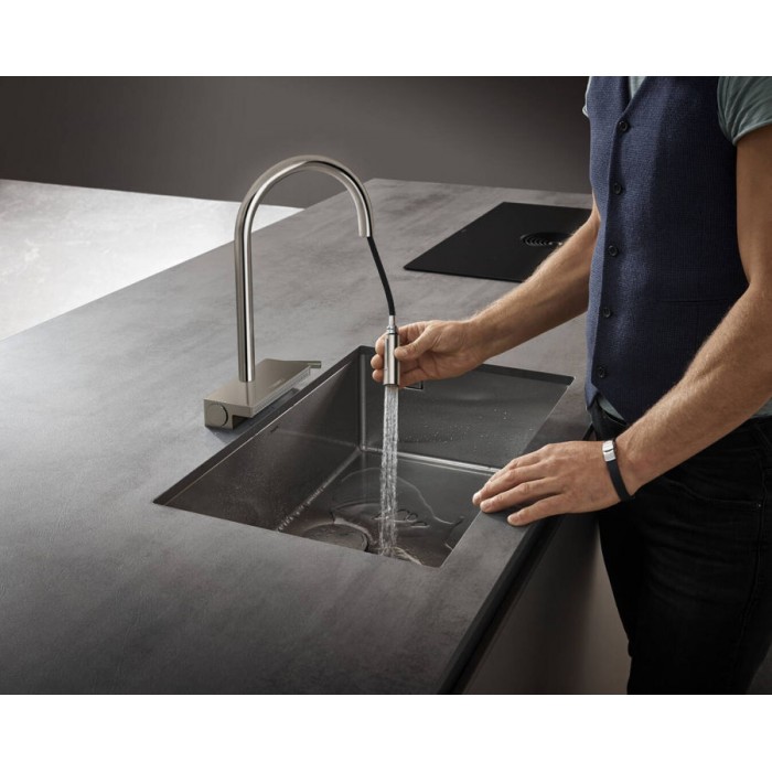 - Μπαταρία κουζίνας επικαθήμενη από ορείχαλκο με ντους 170, pull-out 3 ροών, με καταρράκτη SatinFlow & κουτί σπιράλ sBox & στραγγιστήρι, Stainless Steel Finish, χρώμα: Χρωμέ επιφάνεια: Βουρτσισμένη