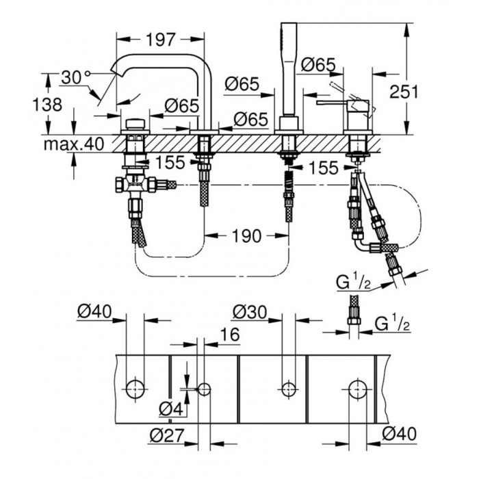 Μπαταρία μπανιέρας επικαθήμενη εξωτερικό μέρος από ορείχαλκο 4 οπών, χρώμα: Χρωμέ επιφάνεια: Γυαλιστερή Επικαθήμενες