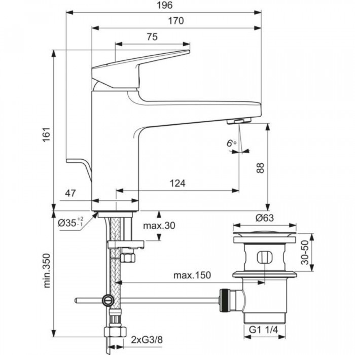 Μπαταρία νιπτήρος επικαθήμενη αναμεικτική από ορείχαλκο με βαλβίδα pop-up H90, Grande Y16,1cm, χρώμα: Χρωμέ επιφάνεια: Γυαλιστερή- Κατασκευαστής: Ideal Standard
